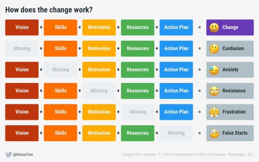 It is not a question of if change is needed; change is necessary. I would not want my orthopedic surgeon to use techniques from 15-20 years ago to repair my child’s torn ACL when such improved modern techniques and tools exist around Arthroscopic surgery. However, in order to manage complex change and make it last, certain steps need to be in place (vision, skills, motivation, resources, action plan). If any one of those steps are missing the change you are trying to implement will fail. While there are several versions of Knoster’s work (1991) this graphic outlines the steps I am referring to and what occurs when any one of them is missing.